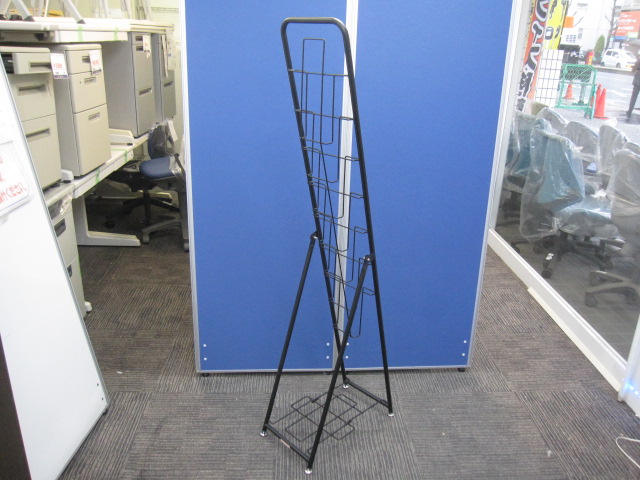 A4サイズのチラシやパンフレットを7段に収納できる折りたたみ式のパンフレットスタンドシングル。ベース部分はストックが置けるラックになっています。屋内でご利用ください。